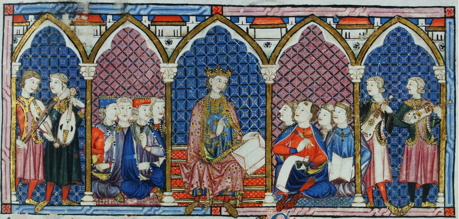 A la izquierda de la escena está representado el músico con unos ropajes rosados y dorados. Está mirando hacia el centro de la imagen mientras tañe su instrumento, el cual está sujetando con su mano izquierda y apoyado sobre su hombro. Con su otra mano agarra un arco.