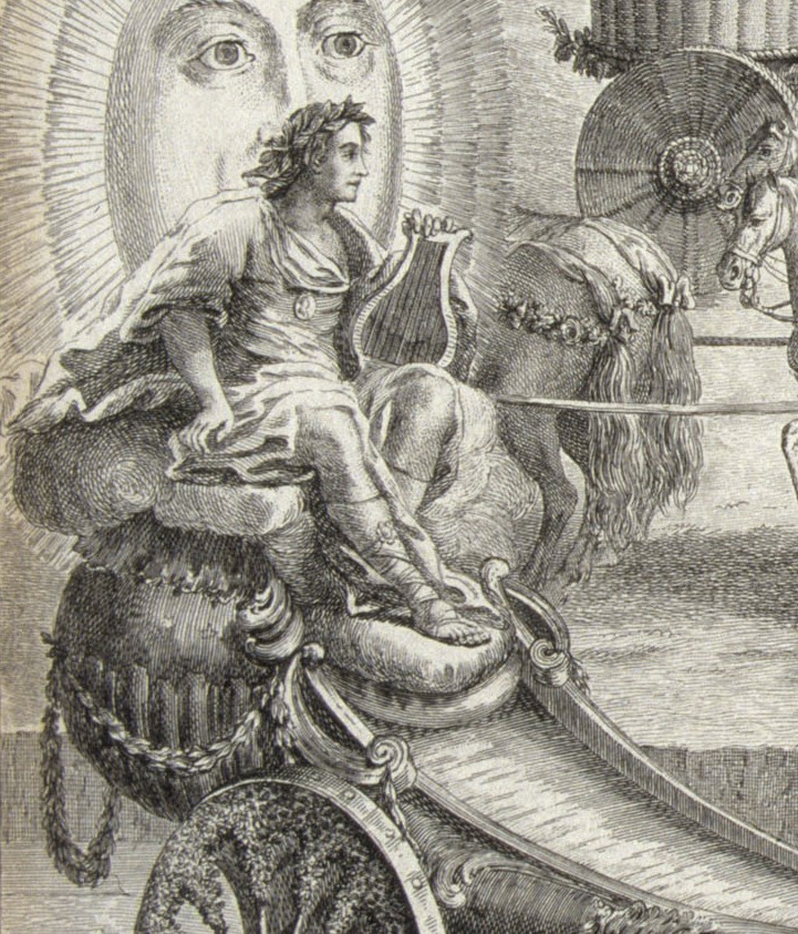 Apolo, sentado en un carro ornamentado, sujeta una cítara-lira de frente al espectador. Detrás de su cabeza, la imagen del sol.