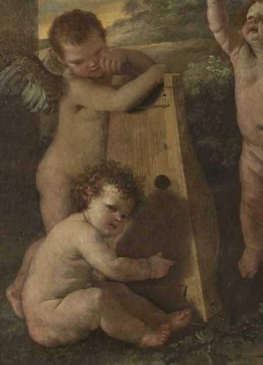 A la izquierda de la composición hay dos pequeños ángeles músicos que están tocando con los dedos un instrumento de cuerda pulsada.