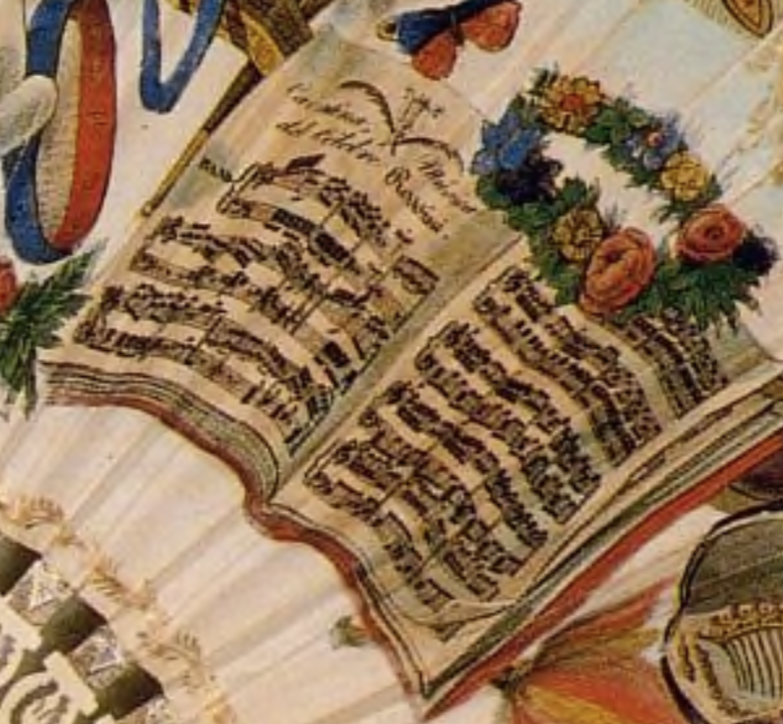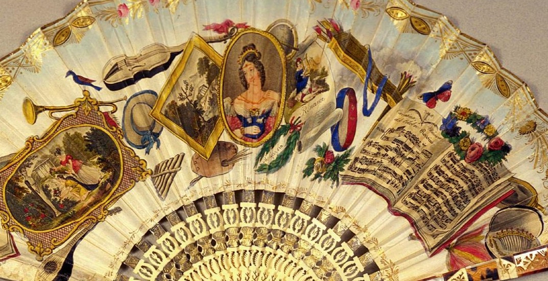Instrumento de viento que aparece en la parte superior derecha de la escena representada en el abanico en un espacio abierto.