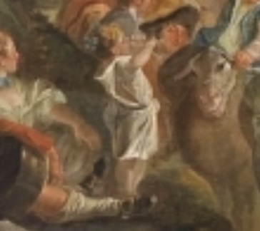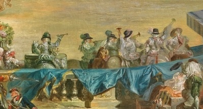 En la franja inferior del cuadro destaca una línea con gran cantidad de personajes de la corte y populares. A la izquierda, un niño vestido de blanco, puesto en pie, toca un pito o un tipo de flauta recta que sujeta con las dos manos, ante la mirada indiferente de los que le rodean. A la derecha, un personaje popular, quizás un mendigo, está subido a una mesa de madera y levanta una pierna, posiblemente llevando el ritmo de los músicos situados delante de él, o imitando un paso de danza ante las damas.