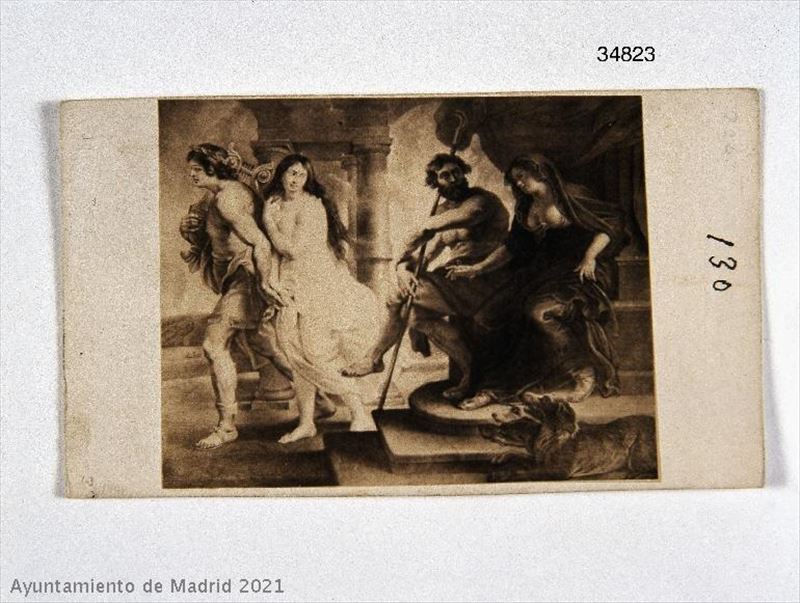 Escena de la muerte de Eurídice. En la escena está Orfeo junto a Eurídice en el extremo izquierdo de la pintura. A su derecha, Plutón y Proserpina. Se trata de una fotografía de un cuadro de Rubens.