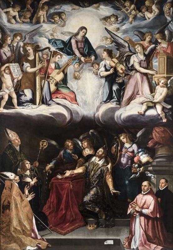 La pintura forma parte de la escuela manierista sevillana de Juan de Uceda y Alonso Vázquez. Consta de dos partes bien divididas, una terrenal y una celestial, una realizada por cada pintor. El tema ...