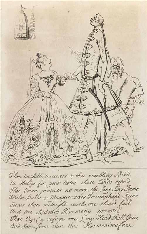 Carlo Broschi estuvo en España entre 1737 y 1759. Se ve a dos cantantes de ópera en traje de actuar, y un hombre disgustado sentado. La cantante, Francesca Cuzzoni (1700-1770) de pie a la izquierda, ...