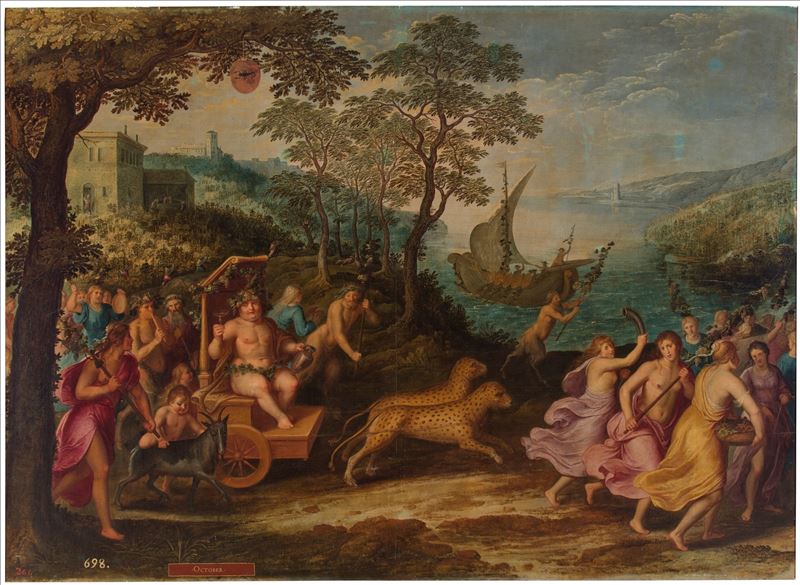 El Triunfo de Baco y su séquito simbolizan el mes de octubre. Dioniso-Baco aparece montado sobre un carro tirado por panteras y a su alrededor un tropel de personajes (ménades, sátiros y otros) ...