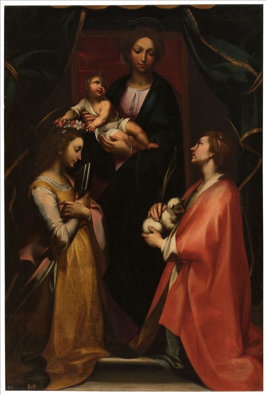 La Virgen entronizada sostiene al Niño entre sus brazos flanqueada por las Santas Cecilia e Inés. Las santas están representadas con sus atributos iconográficos característicos: Santa Inés viste ...