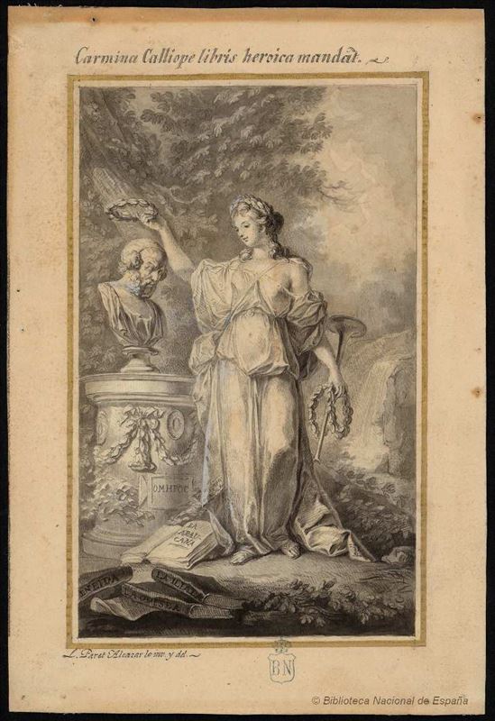 Calíope está de pie, frente a un fondo de paisaje; coronando con laurel el busto de Homero. Con su mano izquierda sostiene una trompeta recta y dos coronas de laurel.